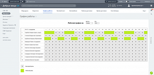 • Составление графика работы для сотрудника, по каждому дню, 2/2, 2/5 и любое число рабочих, нерабочих дней.